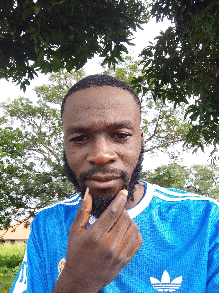 A close-up portrait depicts an adult male with dark skin, short dark hair, and a full dark beard, looking directly at the camera. He wears a blue short-sleeved shirt featuring white stripes on the shoulders, a white collar trim, and a white Adidas trefoil logo on the lower right front. A crest, consistent with a football club emblem, is present on the upper left chest. His right hand is positioned with the thumb and index finger touching his beard; the fingernails on these digits are noticeably elongated. The background consists of dense green tree foliage beneath a light sky, with a building featuring a reddish-brown roof faintly visible in the far left distance. The scene is located outdoors in Maigizo, Nigeria.