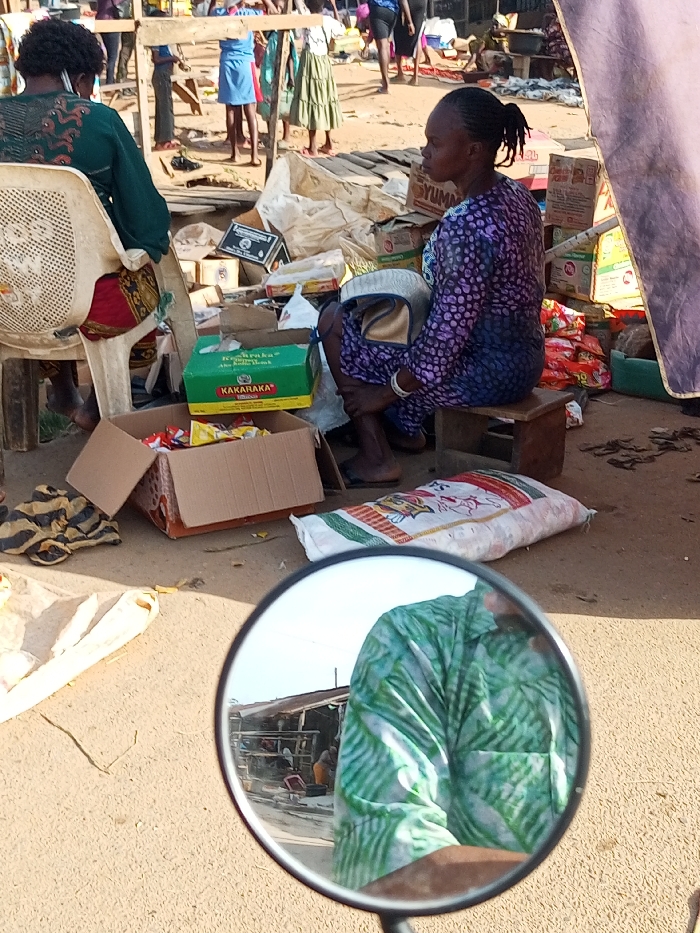 This image depicts an outdoor market scene in Aramoko, Nigeria. In the immediate foreground, a circular motorcycle mirror reflects the torso and arm of an individual wearing a green and white patterned shirt, partially obscuring the ground. The ground is a reddish-brown, dusty surface. In the midground, two women are seated. To the left, a woman with dark, short, curly hair is seen from behind, sitting on a white plastic chair. She wears a dark green long-sleeved top with a subtle pattern and a red and gold patterned wrapper. An open cardboard box filled with various packaged goods sits near her feet. To the right, another woman with dark braided hair, pulled back, sits on a small wooden stool, facing left. She wears a purple and blue patterned dress and has white bangles on her left wrist. A light-colored bag rests between her legs. Both women have bare feet visible. Between and around the seated women, various objects are present. These include a green box labeled "KAKARAKA ARO Juba Baba," multiple other cardboard boxes, some stacked and some open with contents visible, and general market debris. A white sack with red and green markings lies horizontally on the ground near the woman on the stool. In the background, multiple individuals, predominantly women, are visible amidst what appear to be makeshift market stalls constructed from wooden frames and draped materials. Figures are seen standing and moving, wearing various clothing including a blue dress and a green patterned dress. The overall environment suggests a bustling commercial area under daylight conditions.
