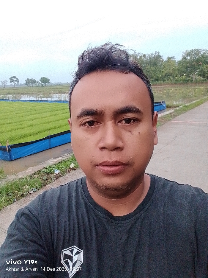 A medium shot captures a man with dark hair and a gray t-shirt. He faces the camera. Behind him is a landscape featuring a flooded field with young green crops and a blue barrier. A concrete path stretches into the distance, where trees are visible. The photo has a natural light, giving it a realistic and candid feel. The bottom left corner shows a "vivo Y19s" watermark with the date "14 Des 2025".