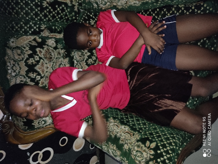 Two individuals are depicted in an indoor setting within the city of Onitsha, Nigeria. They are seated or leaning against an upholstered piece of furniture, likely a sofa, covered in a dark green fabric with an intricate patterned design in lighter tones. A wooden furniture component with an ornate carving is visible behind the individual on the left. The individual on the left is an older child or adolescent, wearing a short-sleeved red top with a white V-neck collar and white trim on the sleeves, paired with a dark brown skirt. Her left hand is raised to her face, and her right arm is bent across her midsection. Her eyes appear partially closed. The individual on the right is a younger child, wearing a matching short-sleeved red top with a white V-neck collar and white sleeve trim, and dark blue shorts with white stripes along the sides. Her hands are clasped in front of her midsection. Her gaze is directed forward. A watermark "REDMI NOTE 9S AI QUAD CAMERA" is visible in the lower-left corner of the image.
