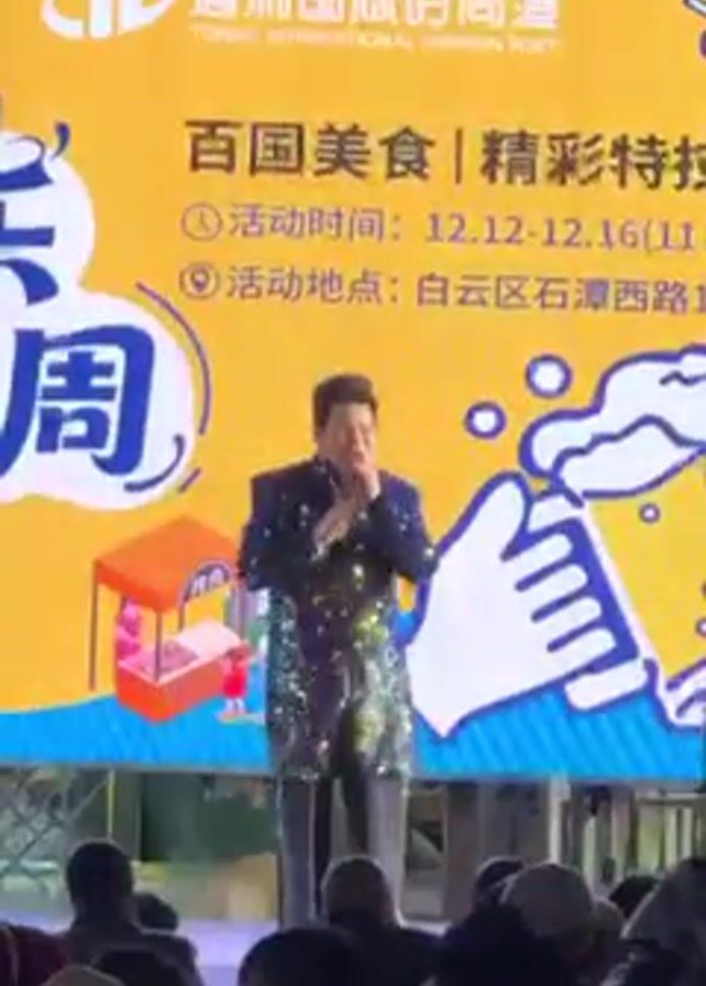 A middle-aged man is singing on stage at an outdoor event. He is wearing a sparkly blazer and dark pants. He is holding a microphone. Behind him is a large yellow screen displaying the event's logo and information: "TONGLI INTERNATIONAL FASHION PORT", "Hundred Country Cuisine/Special Performances", "Activity time: 12.12-12.16 (11:00-)", "Activity location: Baiyun District Shitan West Road 118-22". There are graphics of food stalls, beer, and BBQ skewers on the screen. A crowd of people is watching the performance from below the stage.