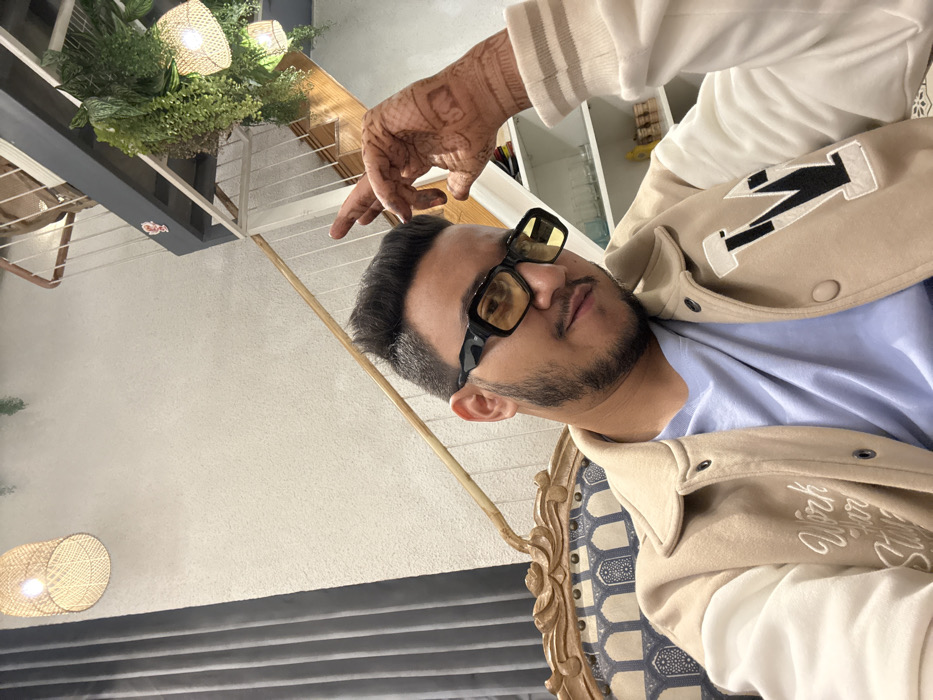 A man in a beige jacket and black sunglasses is angled, possibly sitting in a decorative chair. He wears a light blue shirt beneath the jacket, and a hand with what looks like temporary henna designs is visible above his head. The background shows ceiling fixtures resembling woven lamps, green plants, and partial views of white walls and shelving. The jacket has a large white "M" patch on the chest.