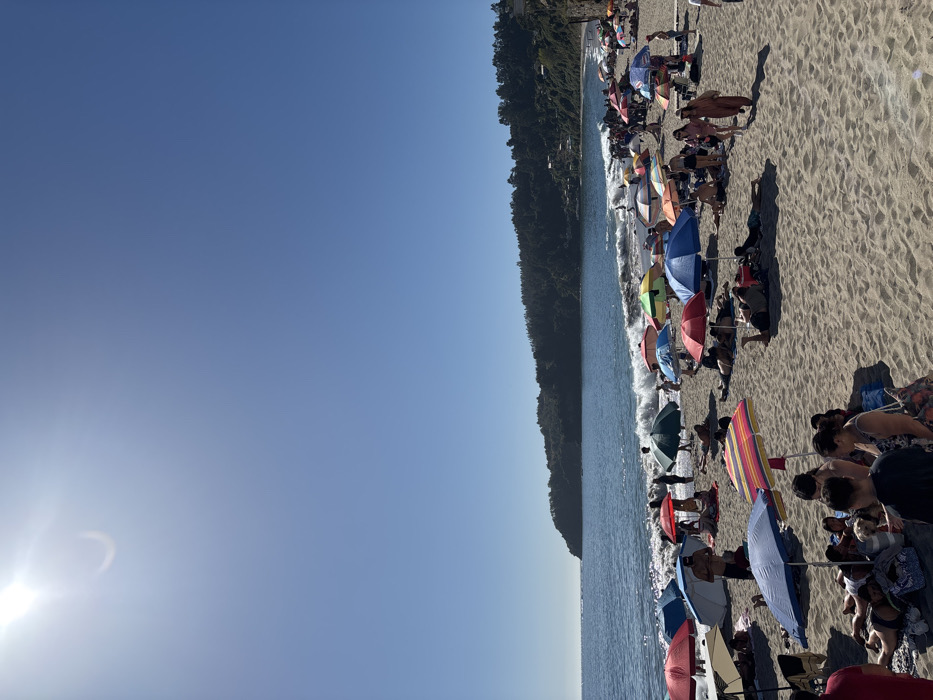 - "The image displays a densely populated sandy beach in Tomé, Chile, under a clear, bright blue sky with the sun visible in the upper-left, producing a lens flare" by FM-CB7hJ2, licensed under CC BY 4.0