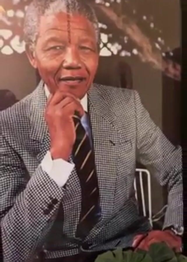 A framed portrait of Nelson Mandela hangs on a light beige wall between two houndstooth-patterned armchairs. A small, light blue circular table sits between the chairs. A small plant sits on a stand in front of the portrait. The camera zooms out slightly to show more of the room. Sounds of people talking are heard in the background.