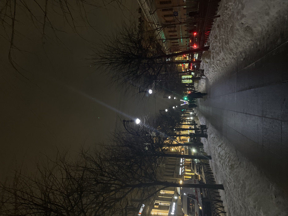 A nighttime view of a snow-lined street with bare trees lining the sides. Streetlights illuminate the walkway, casting a glow on the pavement. Buildings with lit windows are visible along the street. People walk in the distance on the right sidewalk. Cars and buses are driving on the street along the sidewalk. A faint beam of light stretches from a distant streetlight into the dark, cloudy sky. The scene captures a quiet, urban winter setting.