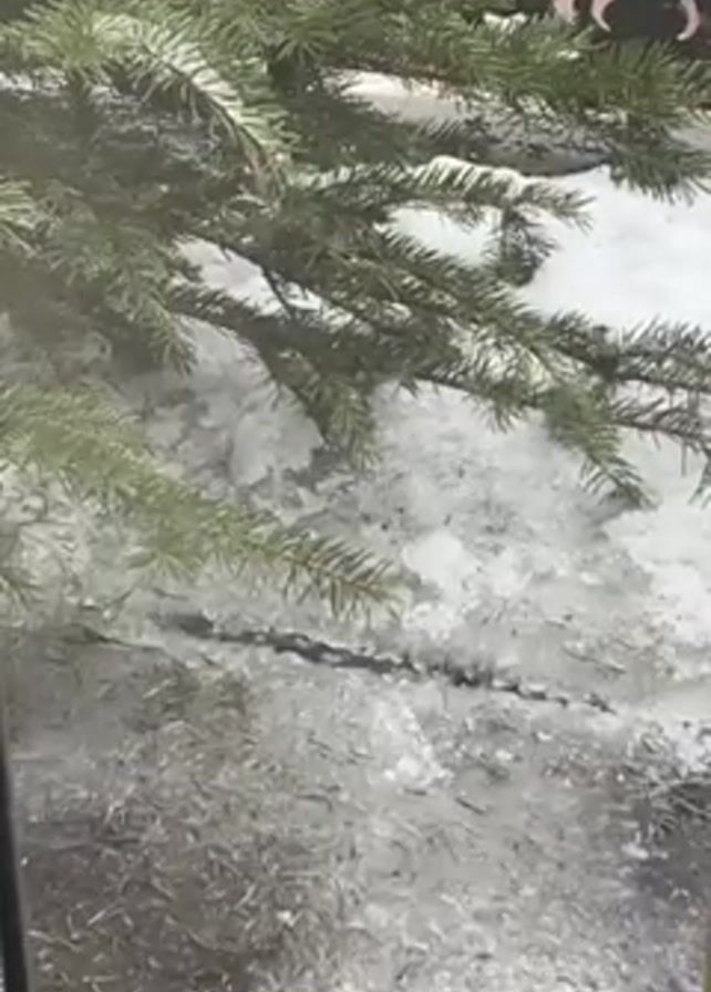 snow and ice on the ground, near a green pine tree. There is a small, ornate wrought-iron object visible in the background. Someone is speaking in the background.