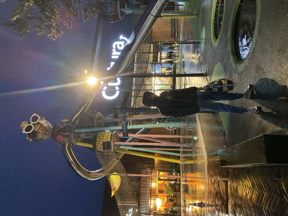 A person stands on a wet, modern playground beside a fountain. The person is wearing a dark jacket, blue jeans, and sneakers, and they're carrying a patterned bag. Behind the person is a complex playground structure with colorful supports, circular shapes, and a large owl-like figure on top with sunglasses. "Cultura" is lit up in large letters above. The area is well-lit, and a building is visible in the background. The sky is dark.