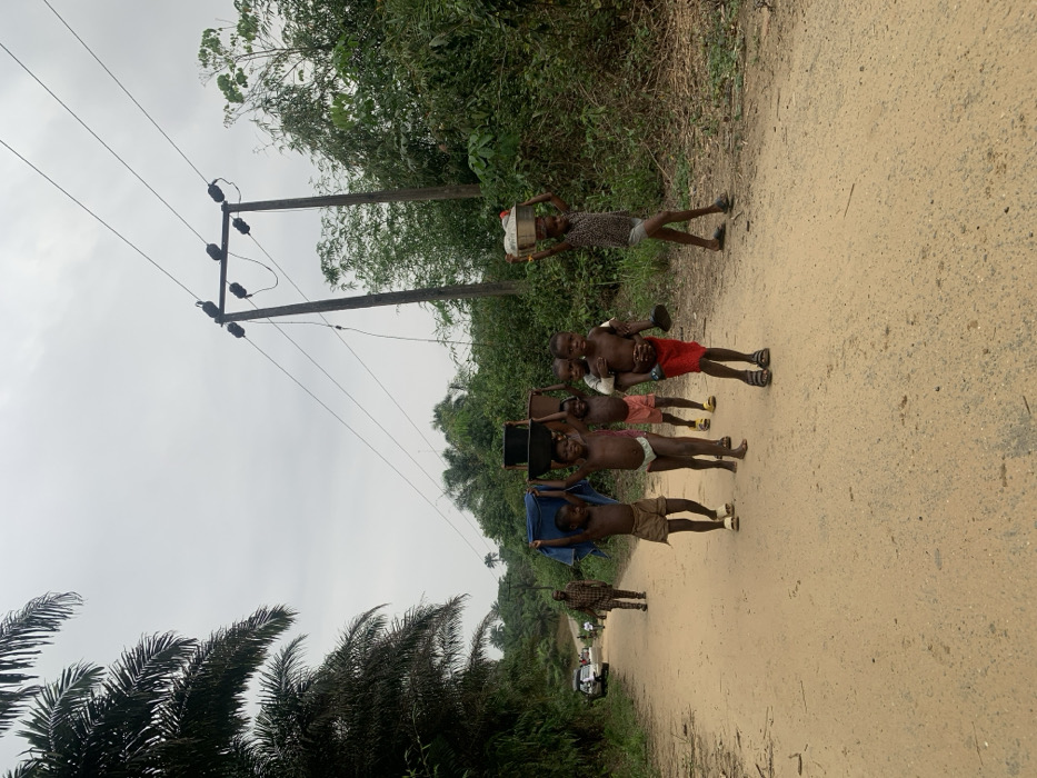 The image depicts a rural dirt road in Ikot Obio Ata, Nigeria, under an overcast sky