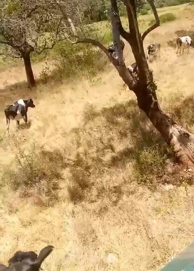herd of black and white cows drinking from a trough in a field. The field is dry and grassy, with trees in the background. The camera pans to show the cows as they drink. A person's foot is briefly visible in the frame.