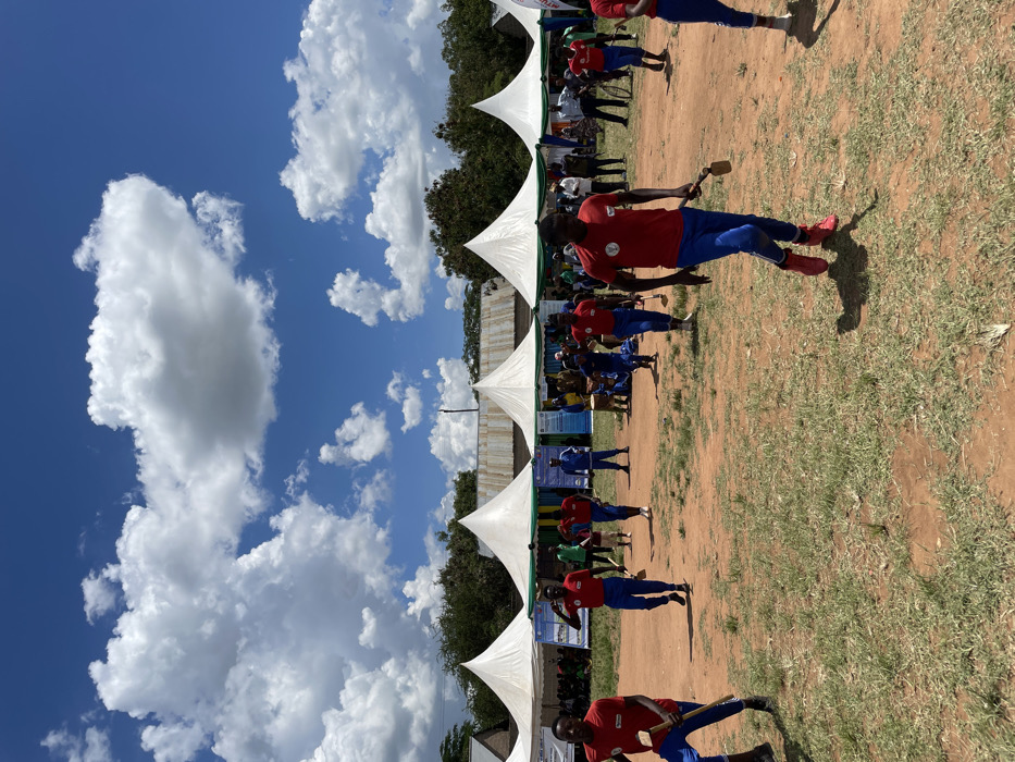 group of young men in red shirts and blue pants participating in a traditional dance in a field in Bariadi, Tanzania, located at latitude: -2.797, longitude: 33.991. The men are holding wooden sticks and are moving in a synchronized manner. The dance is taking place in front of a line of white tents, which are set up under a bright blue sky with white clouds. There are spectators in the background, some of whom are watching the dance while others are standing around. The men are smiling and appear to be enjoying the dance. The dance is a celebration of Tanzanian culture and tradition.