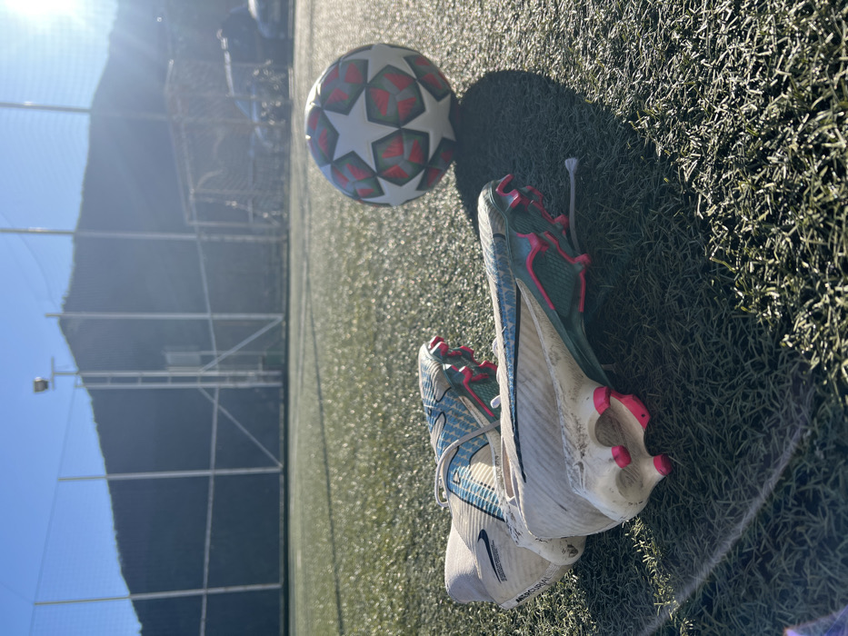 The scene is an artificial turf soccer field in Oryahovets, Bulgaria, under clear, bright daylight. In the foreground, a pair of worn white Nike Mercurial soccer cleats, detailed with light blue patterns and vibrant pink soleplate studs, lies on the green artificial grass. A white soccer ball, featuring a pattern of black pentagons and red-outlined white stars, is positioned to the right and slightly behind the cleats. Both objects cast elongated shadows to their left, indicating a low sun angle from the right. The blurred background reveals a perimeter fence with vertical supports and a floodlight fixture. A soccer goal with a net is visible further to the right, beyond which several vehicles are faintly parked. A line of dark, tree-covered mountains forms the distant horizon.