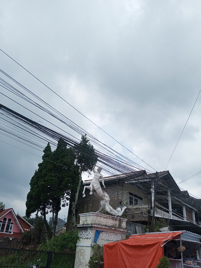 The scene in Batulawang, Indonesia, depicts an outdoor environment under an overcast, light gray sky. Numerous black electrical and communication wires traverse the upper and mid-sections of the frame. Central to the image is a white centaur statue, depicted in a rearing posture, mounted on an ornate white pedestal with visible decorative molding; the pedestal's lower left section shows a blue covering or discoloration. Behind the statue are several tall, dark green coniferous trees. To the right, a multi-level building constructed with light-colored masonry and featuring a dark-tiled roof is visible, along with an open ground floor supported by pillars. A house with a pink roof is partially visible on the far left. At street level, below the statue, a black metal fence is present. Adjacent to the statue's pedestal on the right, a temporary market stall is erected, distinguished by a bright orange tarp roof and displaying what appears to be dried produce. No human figures are present.