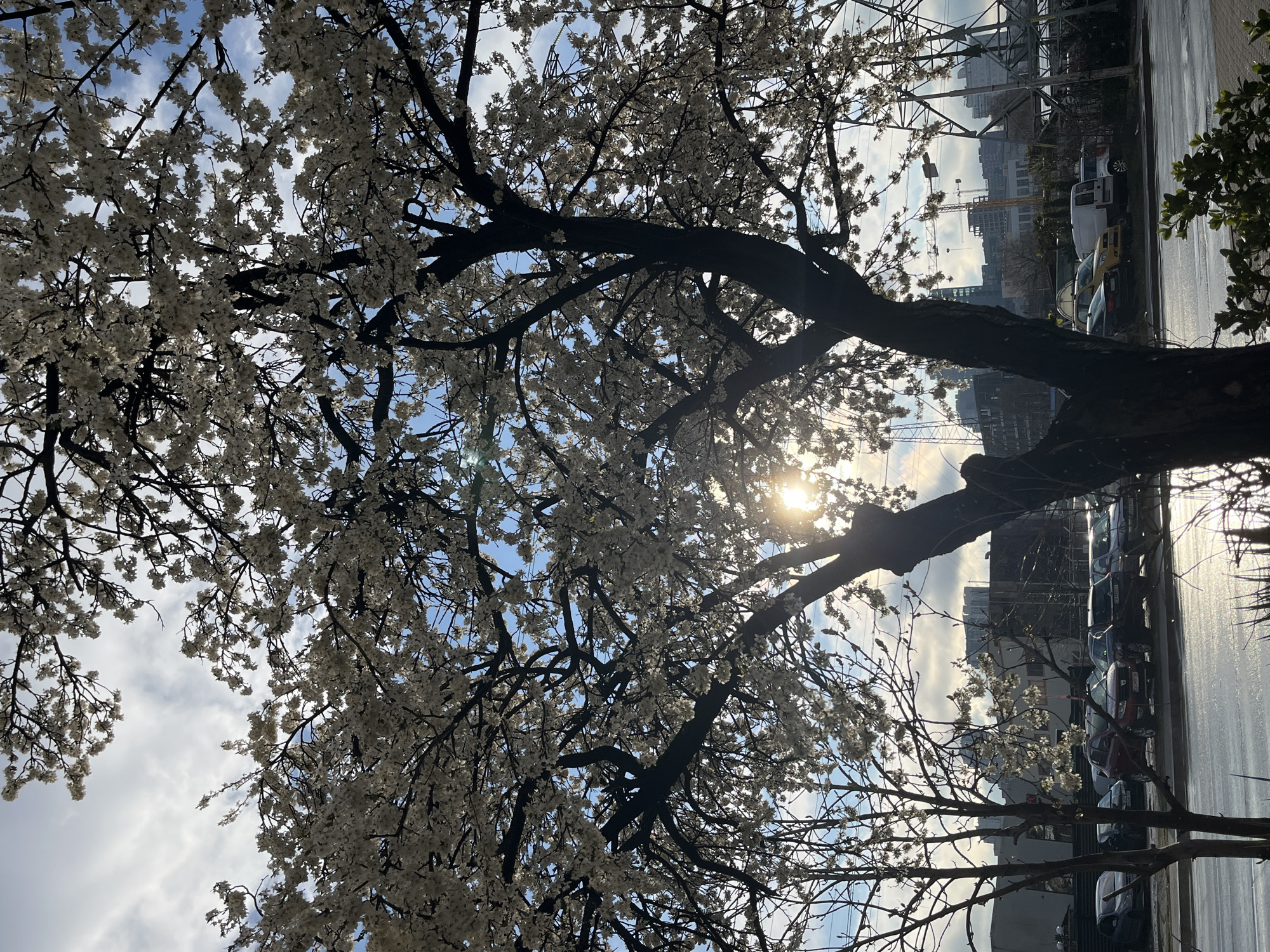 The scene depicts an urban landscape in Sofia, Bulgaria, identifiable by the "CA" prefix on a visible license plate. A large deciduous tree, currently covered in white blossoms, occupies the central and upper frame, its dark branches silhouetted against a partly cloudy blue sky. The sun is positioned low, behind the lower-middle section of the blossoming tree, casting a bright lens flare and backlighting the tree's foliage. To the left, a smaller tree with bare branches is partially visible. A wet asphalt road or street traverses the midground horizontally. Along the far side of this road, several vehicles are parked, including a red Dacia Duster (license plate CA 2497 JH), various sedans, and a white commercial van. In the background, a cluster of modern multi-story buildings, some appearing to be under construction with visible tower cranes, line the horizon. Large metal lattice power line structures are visible on the far right background. No individuals are present in the image.