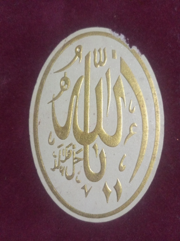 A circular emblem, approximately 7-8 cm in diameter, rests on a deep maroon, possibly velvet, background. The emblem features a white circular field bordered by a thin gold line. Centered within the white field is stylized gold Arabic calligraphy, prominently displaying the word "Allah" (الله) with a metallic, possibly embossed, finish. Additional smaller gold Arabic script is visible below and to the left of the central inscription. The top-right edge of the white emblem exhibits minor tearing or rough texture. The maroon background is featureless and appears to be a flat surface. No individuals, actions, or specific environmental details beyond the immediate object and its background are present. The object is depicted within the implied context of the city of Zee Pin Kone, Myanmar.