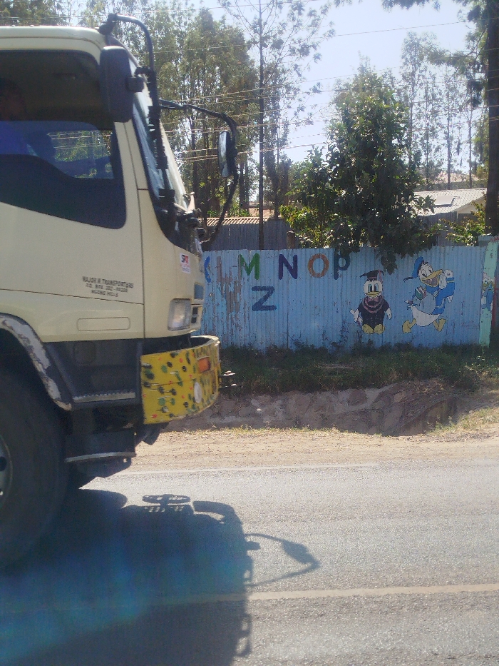 The image captures a roadside scene in Olkeri ward, Kenya, dominated by a partially visible light-colored truck on the left. The truck's cab displays text identifying "MAJUA & TRANSPORTERS P.O. BOX 202-KIGALI NGONG HILLS." A yellow bumper with multicolored circular decals is visible below the cab. An arm and shoulder of a person are discernible inside the truck's cabin. The truck casts a prominent shadow on the asphalt road, which features a light-colored line. To the right of the road, a dirt shoulder precedes a light blue corrugated metal fence. This fence is painted with large, colorful letters: "(C) L M N O P" and "Z" below, along with two cartoon depictions of Donald Duck. One Donald Duck character is dressed in a graduation cap and gown, while the other appears to be running, carrying a sack or bag. The fence exhibits weathering and peeling paint. Beyond the fence, an abundance of tall, slender trees and some building structures are visible under a clear, bright sky.