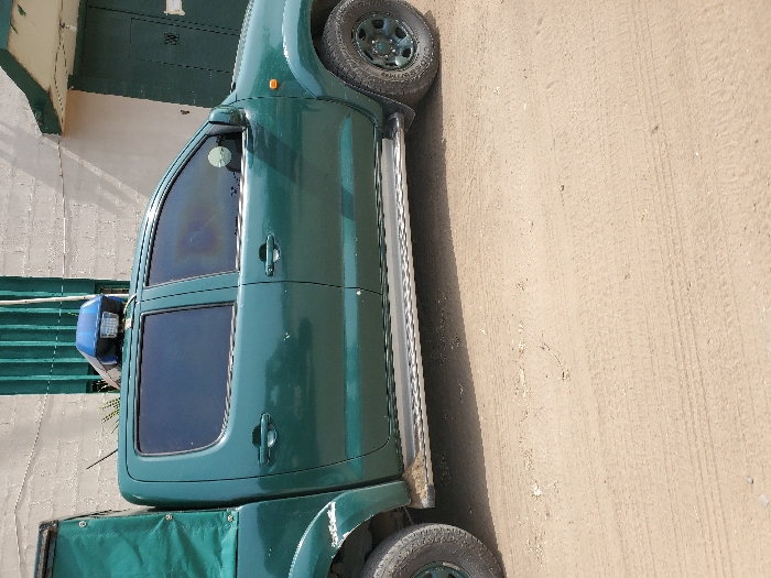 A dark green, four-door pickup truck, consistent with a Toyota Hilux, is parked on an unpaved dirt road in Satellite Town, Nigeria