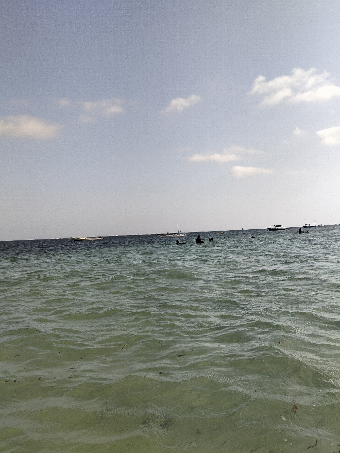 The image displays a tranquil beach scene under a lightly clouded sky. Calm waves ripple across the water's surface, tinged with green. Several boats and people are visible in the distance, suggesting a populated area. The overall composition evokes a peaceful, summery atmosphere.