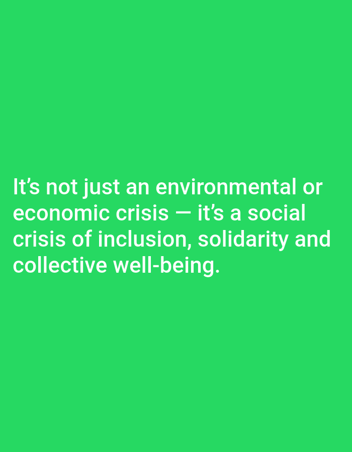 This digital graphic, situated in Lhokseumawe, Indonesia, presents a solid, bright green background that occupies the entire frame. White sans-serif text is centrally aligned in the lower half, reading: "It's not just an environmental or economic crisis — it's a social crisis of inclusion, solidarity and collective well-being." No individuals, physical objects, actions, or specific environmental settings are depicted within the image; the scene is purely digital.