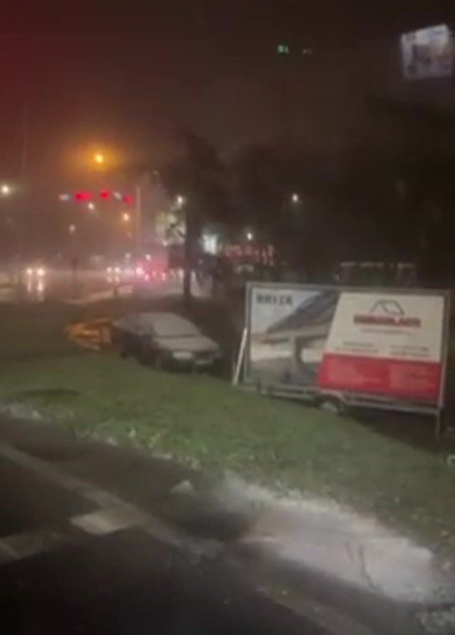 view of a city street at night during some kind of precipitation, potentially snow or hail. The light from the streetlights and the headlights of moving cars reflect off the precipitation in the air. A car parked on a grassy median is covered with a layer of the precipitation. There are also billboards on the median.