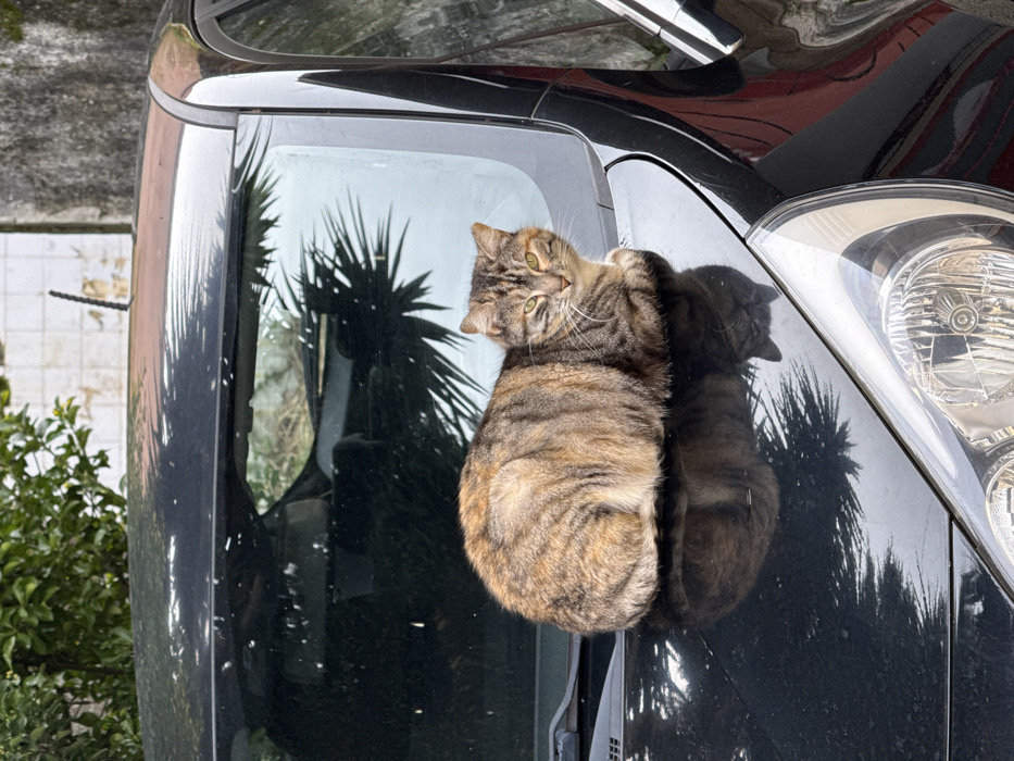 - "A domestic cat, exhibiting a tabby pattern of brown, black, and ginger fur, is observed resting on the glossy black hood of a parked vehicle" by FM-euyLP2, licensed under CC BY 4.0