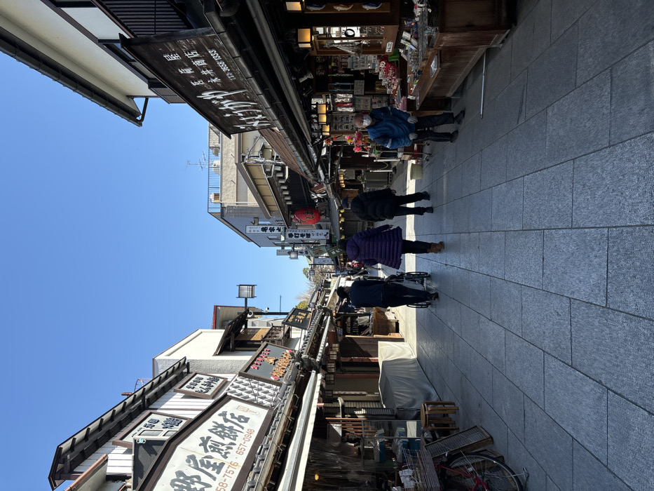 narrow street lined with buildings and shops in Katsushika City, Japan (35.758, 139.877). Four people are walking along the street, all wearing face masks. Three people are wearing dark clothing, and one is wearing a purple jacket. The street is paved with gray square tiles, and the buildings are mostly made of wood. There is a sign above the street with Japanese writing. There are shops on both sides of the street, selling various items. The sky is clear blue.