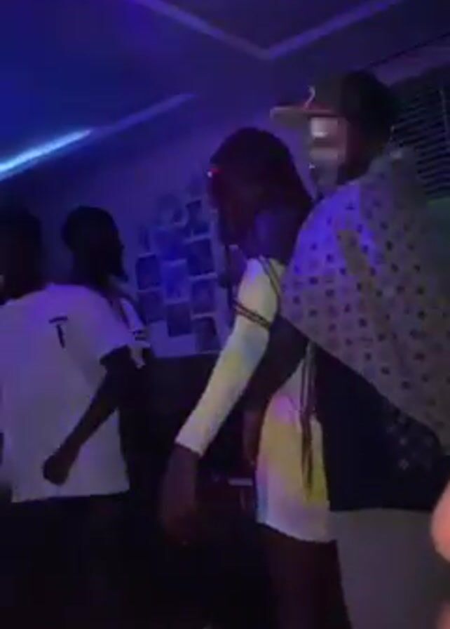 The video captures a dimly lit room with a group of people dancing, illuminated by various colored lights, notably blue, green, and purple