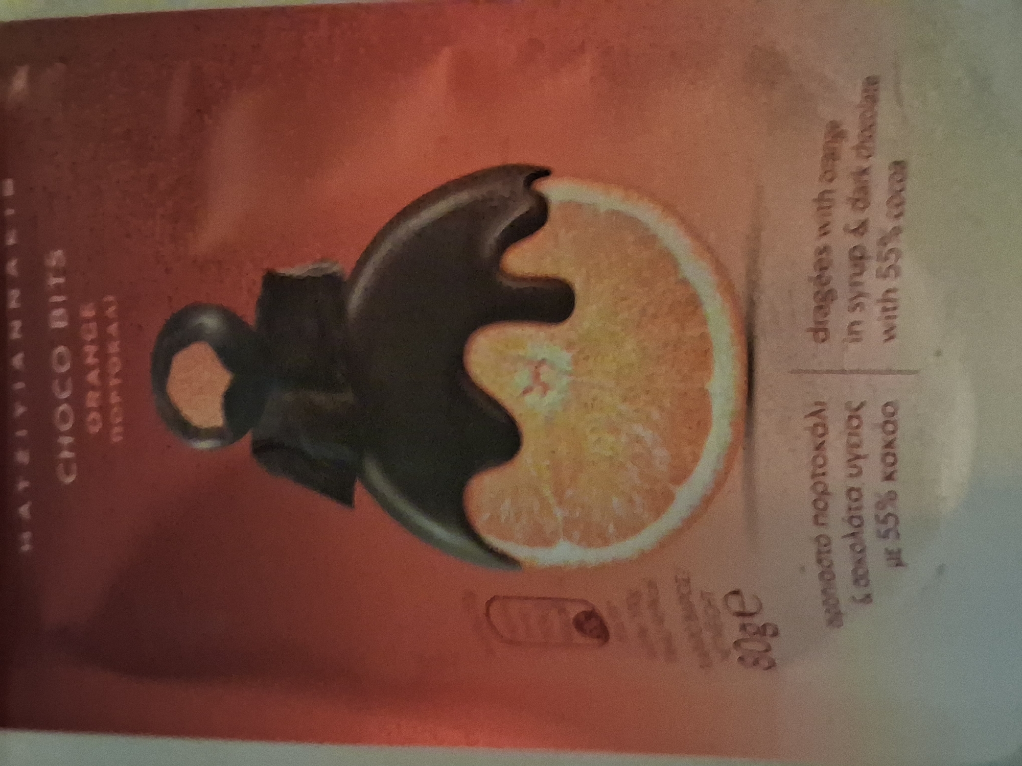 The image displays a close-up of a product package or advertisement for a confectionery item. The central subject is a graphic depicting a cross-section of an orange slice partially submerged in or coated with dark brown chocolate. The chocolate forms a prominent, bulbous layer over the upper and central portion of the orange, with a smaller, distinct piece of chocolate resting on top of the main chocolate mass. The visible lower section of the orange slice displays its characteristic vibrant orange color and segmented interior, bordered by a thin white rind. Textual information is visible across the package: - At the top, partially cropped: "HATZIYIANNAKIS". - Below this: "CHOCO BITS". - Further down: "ORANGE" and "ΠΟΡΤΟΚΑΛΙ" (Greek for orange). - In the lower left quadrant: "80ge" indicating net weight. - In the lower center (Greek): "αποξηραμένο πορτοκάλι & σοκολάτα υγείας με 55% κακάο" (translating to "dried orange & healthy chocolate with 55% cocoa"). - In the lower right quadrant (English): "dragées with orange in syrup & dark chocolate with 55% cocoa". - A small, vertical, rectangular icon, possibly a nutritional fact or instruction, is visible on the left side above the "80ge" text. The background of the packaging is a uniform reddish-brown color, showing minimal textural variation. The edges of the physical packaging are visible and slightly blurry, suggesting the image captures the packaging itself, possibly laid flat against a lighter, indistinct surface. No people are present, and no actions or interactions are depicted. The location of this scene in the city of Varna, Bulgaria, cannot be determined from the content of the image.