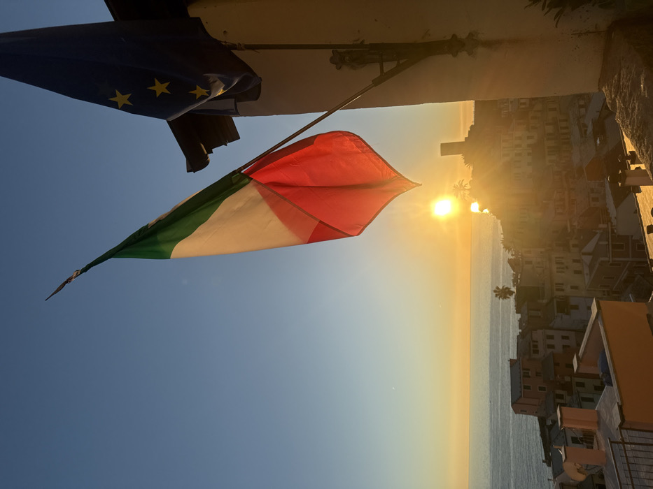 This image captures a high-angle view of Vernazza, Italy, at either sunrise or sunset, looking west over the Ligurian Sea. In the upper right quadrant, an Italian flag, displaying vertical green, white, and red stripes, is prominently mounted on a light-colored building. Adjacent to it, a European Union flag, depicting a blue field with twelve yellow stars, is also mounted but largely obscured in shadow. A dark eave extends from the building above the flags. The sun is visible as an intensely bright disc low on the horizon, casting a strong golden glare that reflects on the calm surface of the sea. The sky transitions from a clear, light blue overhead to a warm orange and yellow hue near the horizon. Below the flags, the colorful, clustered buildings of Vernazza cascade down the hillside towards the coastline. These structures are illuminated by the warm, direct light of the low sun. On the distant right, a distinct stone tower, characteristic of Doria Castle, stands silhouetted against the sun's glare. Several rooftops and a balcony with an iron railing are visible in the immediate foreground. Sparse vegetation, including palm trees, is interspersed among the buildings and on the distant hills. No human figures or specific activities are depicted.