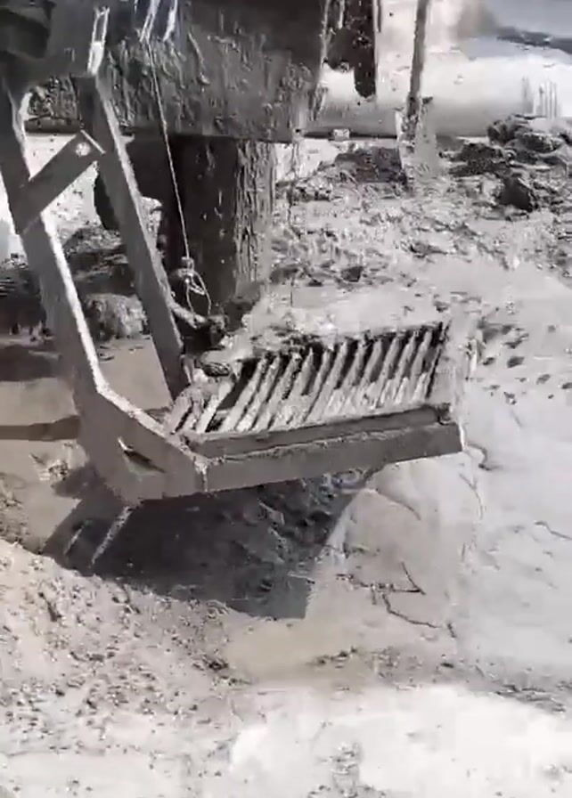 muddy construction site. A large piece of equipment, possibly a drilling rig, is the central focus. It's covered in mud, with a ladder-like structure extending from its base, also covered in mud. The ground is a mix of sand, mud, and water, creating a swampy environment. In the background, there is a brick wall and a house painted in red. A shovel and other tools are scattered nearby, suggesting ongoing work. The scene appears to be outdoors during the daytime.