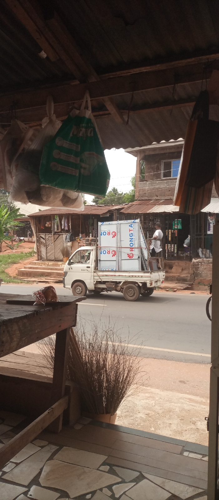 The image depicts a daytime street scene in Umuoji, Nigeria, captured from inside a covered structure, likely a shop or stall. In the immediate foreground, a wooden ceiling with exposed beams and a dark corrugated roof is visible, from which several plastic bags, including a green one with "MAMA" branding, hang. Below, a wooden counter or table displays an item wrapped in plastic, alongside a pot containing dried, tall grass-like material. The floor is tiled with irregular, light-colored stones. In the midground, a paved road with a white dashed line runs horizontally across the frame. A white mini-truck, labeled "BUSH," travels from right to left, carrying several large white rectangular panels, possibly building materials, emblazoned with "RONGTAN BUILDING MATERIAL" in red lettering. A male individual, wearing a light-colored long-sleeved shirt, stands on the back of the truck, appearing to secure or attend to the load. The background features several buildings lining the street. To the left, a rustic, single-story shop or stall with a corrugated metal roof and a slatted wooden facade is visible, displaying various hanging goods. Further left, an unpaved reddish-brown area and green vegetation, including banana trees, are present. To the right, a two-story building with an earthy-toned facade, a balcony on the upper level, and a modern blue-tinted window is seen. Below this, another ground-level structure, possibly a storefront, displays items on shelves behind a metal gate. The sky above is overcast and bright.