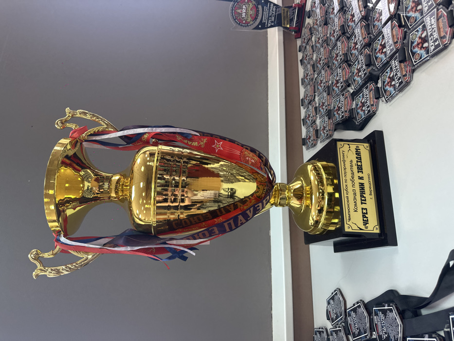 A large, reflective golden trophy, adorned with red, white, and blue ribbons and a red ribbon bearing the "WAF Powerlifting Federation" logo and stars, stands prominently on a black square base. An engraved gold plaque on the base reads "Чемпионский кубок по пауэрлифтингу" (Champion's Cup in Powerlifting), "Команда победитель" (Winning Team), "«ЧЕРЕЗ ТЕРНИИ К ЗВЕЗДАМ»" (Through Thorns to the Stars), and "г. Верещагино" (Vereshchagino city), confirming its origin in Vereshchagino, Russia. The trophy is positioned on a light-colored surface, likely a table, against a plain grey wall with a white trim along its base. To the right of the trophy, multiple rows of dark-colored, possibly hexagonal or octagonal medals are displayed, each featuring a graphic of a powerlifter and the same "ЧЕРЕЗ ТЕРНИИ К ЗВЕЗДАМ" inscription. These medals are equipped with black lanyards. A few similar medals are visible to the left. Further to the right, a smaller clear acrylic award with a black base is present, also marked with "WRP POWERLIFTING FEDERATION" and the phrase "ЧЕРЕЗ ТЕРНИИ К ЗВЕЗДАМ". Reflections of an indoor environment and indistinct figures are visible on the highly polished surface of the golden trophy.