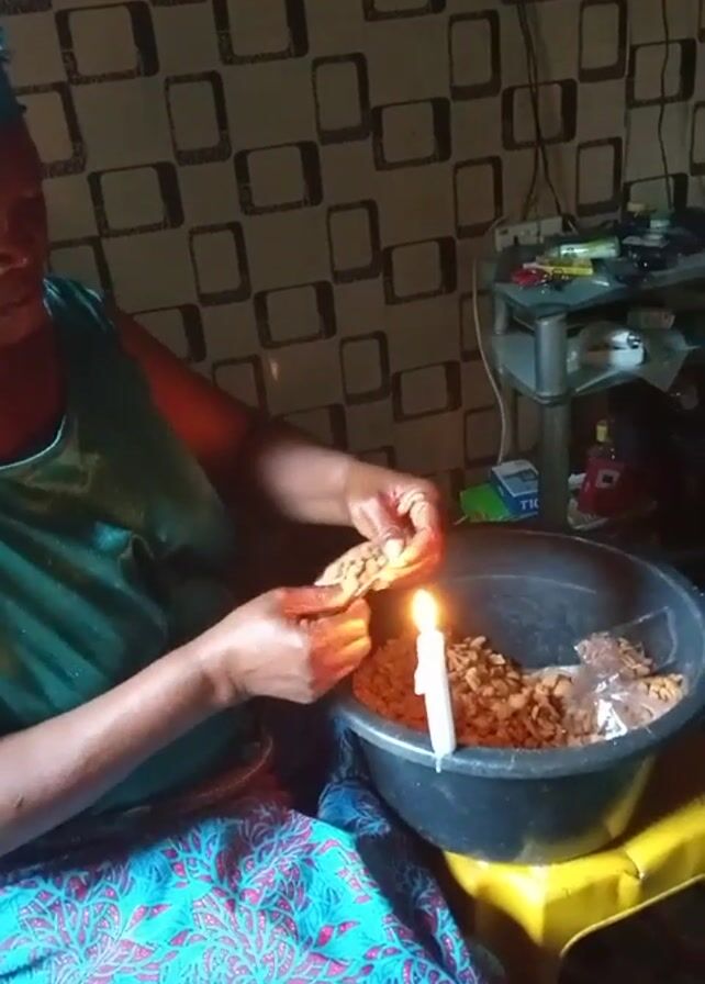A woman sitting indoors is seen holding a package of foodstuff over a lit candle, dripping the wax into a black plastic bowl filled with what appears to be the same foodstuff