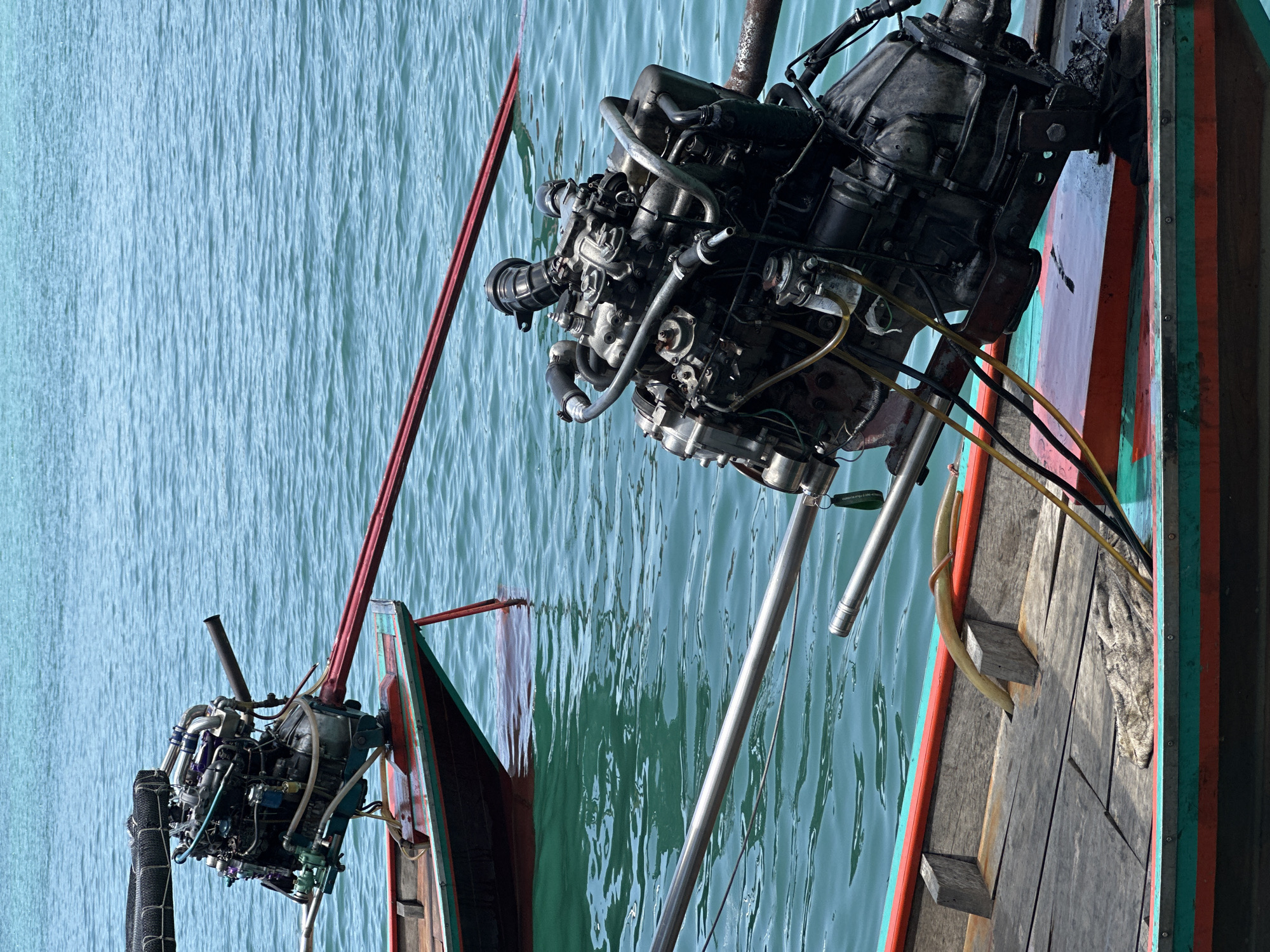The image captures two traditional Thai longtail boats, each equipped with a converted car engine mounted high on a pivoting frame