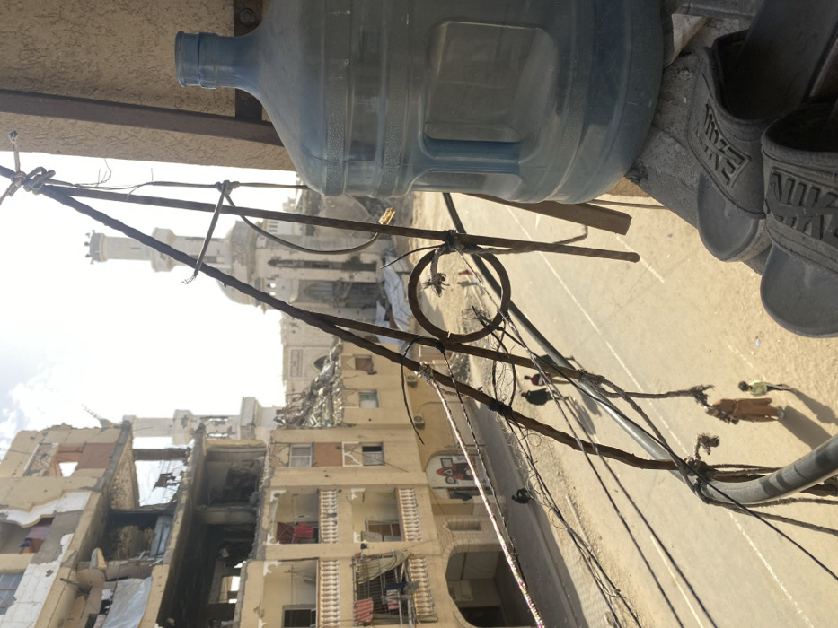 From an elevated vantage point, a damaged cityscape is seen, possibly the aftermath of conflict. Buildings are structurally compromised, exhibiting signs of ruin. A water bottle and sandals sit on a ledge in the foreground. Tangled wires and a metal hoop obstruct the view. In the background, a building with a tower is visible, possibly a mosque or significant structure. Several people are seen walking on the street.