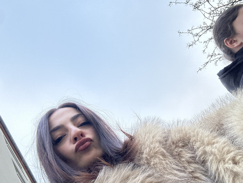 The image, captured from a low-angle perspective in Strasbourg, France, depicts two individuals outdoors against a light blue, overcast sky. In the upper left quadrant, a female with long, dark hair is visible, wearing a light brown, fluffy fur coat. She is looking downwards towards the camera with a pouting expression, her reddish-brown lips pursed, and eyes partially closed. In the lower right quadrant, the top of a second individual's head, their right ear, and a portion of a dark jacket with a hood are visible; this person also has dark hair and is looking downwards. Bare tree branches are present in the background against the sky in the lower right, and a light-colored building facade is partially visible in the extreme upper left corner.