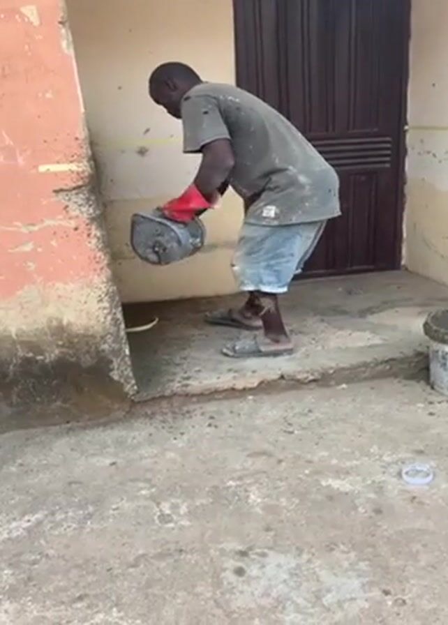 An adult man in a gray t-shirt, blue shorts, and sandals is outdoors in front of a beige building, pouring a liquid mixture from a gray bucket into another gray bucket