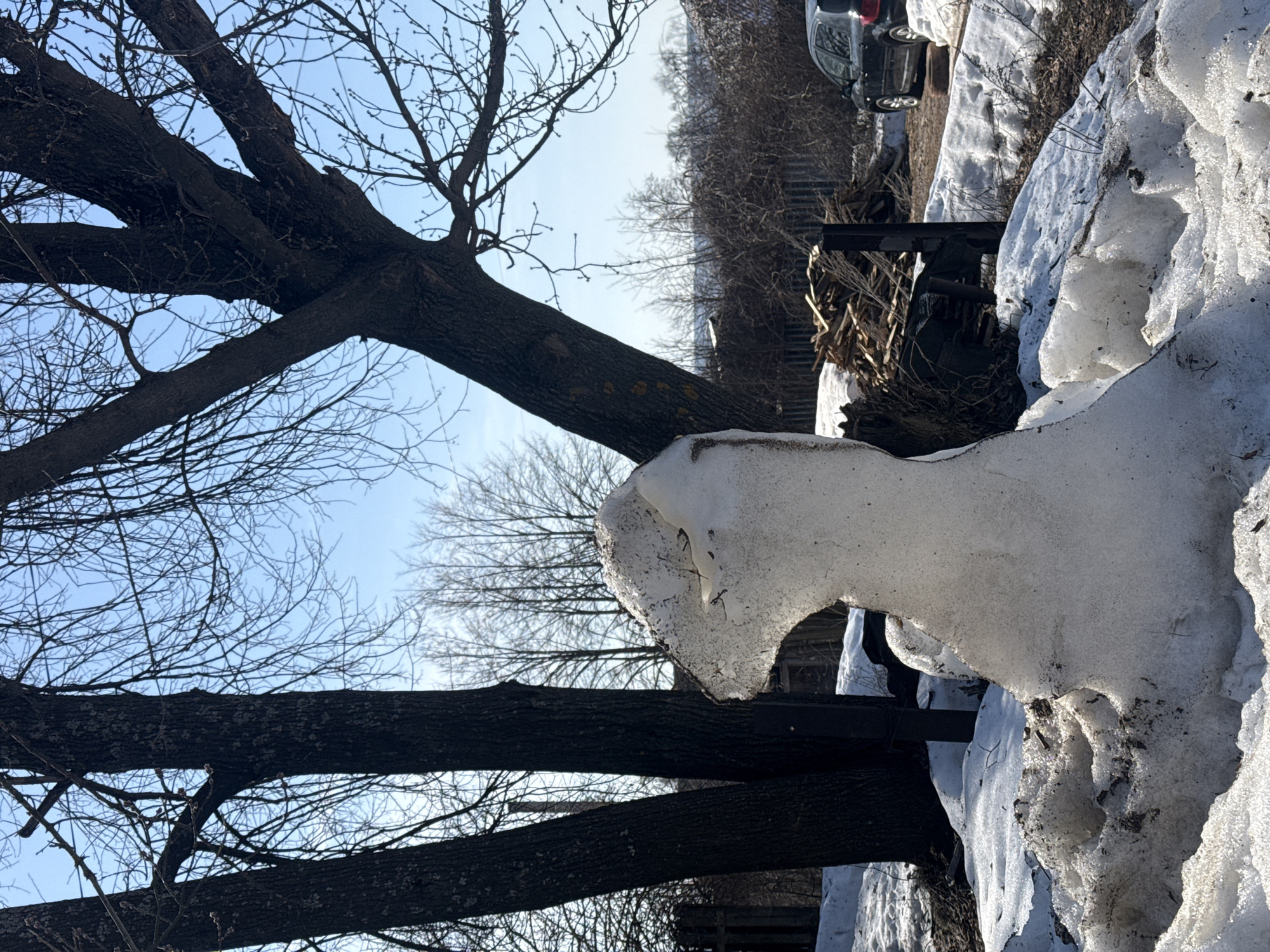 winter scene, possibly in a park or residential area of Votkinsk, Russia. In the foreground, there is a snowdrift clinging to a wooden fence. Patches of dirty snow and ice suggest melting. A leafless tree with thick branches dominates the left side of the frame, its bare limbs reaching towards a pale blue sky. In the background, there's a blurred view of other trees and what appears to be a parked car. The overall impression is of a cold, early spring day in a typical Russian urban setting.
