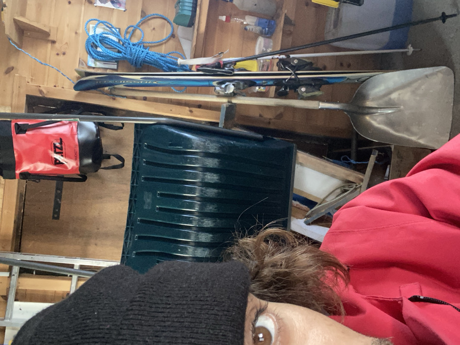 The image depicts a close-up indoor scene, likely a storage area or shed, in La Salle-les-Alpes, France. In the foreground, partially visible on the left, is the upper-left quadrant of a person's face and upper torso. The person has medium brown skin, dark brown eyes, and brown wavy hair visible beneath a black knitted beanie. They are wearing a red jacket with a visible zipper pull on the chest pocket. The person is looking directly forward towards the camera. The background consists of wooden plank walls, suggesting an rustic indoor structure. Various items are stored within the space. A large, dark green plastic snow pusher with vertical ribs is prominently positioned vertically in the center-left. Above it, a red and black "PETZL BUCKET 15L" bag is hanging from a metal support bar. To the right of the snow pusher, a pair of blue and white alpine skis with bindings are leaning against the wall, alongside two ski poles. A metal shovel with a wooden handle stands upright on the floor near the skis. Further right, a coiled blue rope hangs on the wooden wall, above a wooden shelf holding various bottles and containers, some blue and white. A section of a metal ladder is visible leaning against the wall behind the snow pusher. The overall impression is a cluttered but organized utility space for outdoor and winter gear.