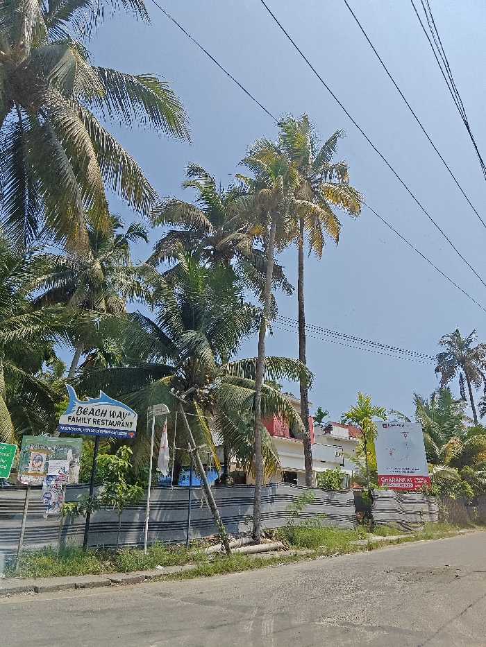 The image depicts an outdoor scene in Andhakaranazhy, India, under a clear blue sky. In the foreground, a weathered asphalt road with a narrow grassy verge runs horizontally. The midground is dominated by numerous tall coconut palm trees, some bearing visible coconuts, alongside other green foliage. A black and white striped fabric barrier or temporary fence extends across the scene. Behind this fence, sections of buildings are visible, including one with a red-painted upper floor and a white lower section, and another white structure further to the right. Two prominent signs are present: a blue, fish-shaped sign displaying "BEACH WAY FAMILY RESTAURANT" in white text, and a large vertical white billboard to its right with "JUNGTOP" and "CHARANRAT" printed in red text. Two white flags on poles are positioned near the restaurant sign. Multiple thin, dark utility lines traverse the upper portion of the clear blue sky. No people or vehicles are present in the scene.