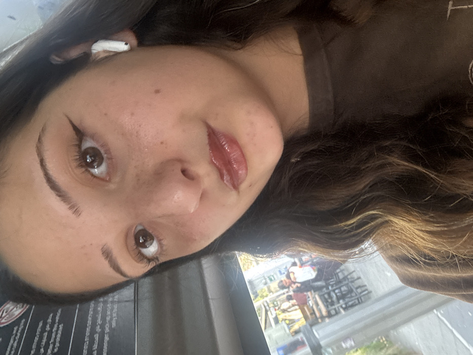 A woman with brown hair and light skin looks directly at the camera. She has eyeliner and glossy lips. A white earbud is visible in her left ear. The background appears to be an outdoor seating area reflected in a window or glass surface. She is wearing a brown shirt. The image has been rotated.