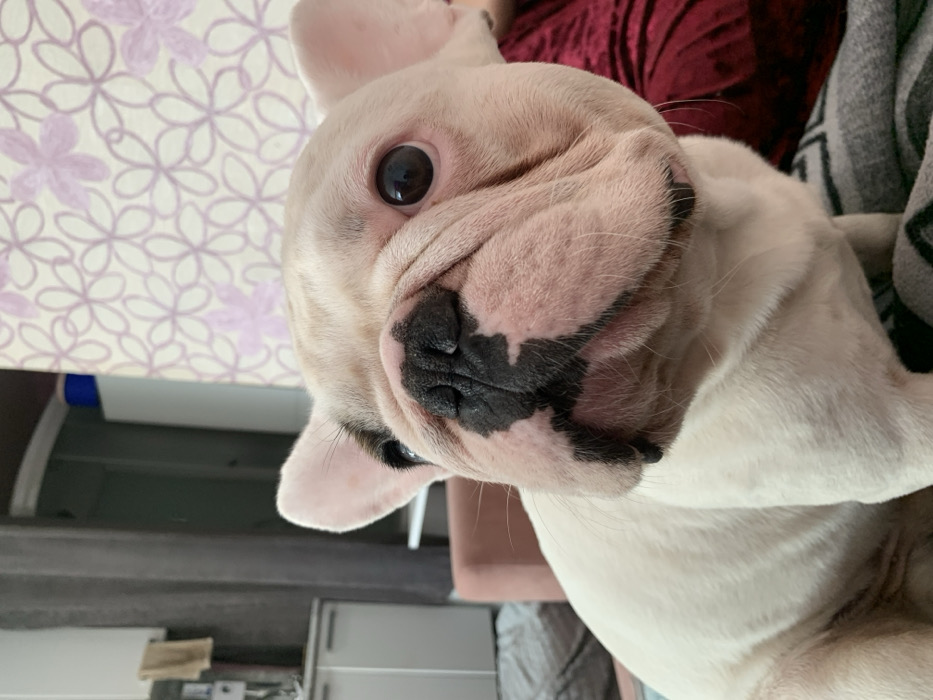 - "A cream-colored French Bulldog with prominent black markings on its left eye, nose, and muzzle is depicted in a close-up, head-and-shoulders shot" by FM-9p7HR2, licensed under CC BY 4.0