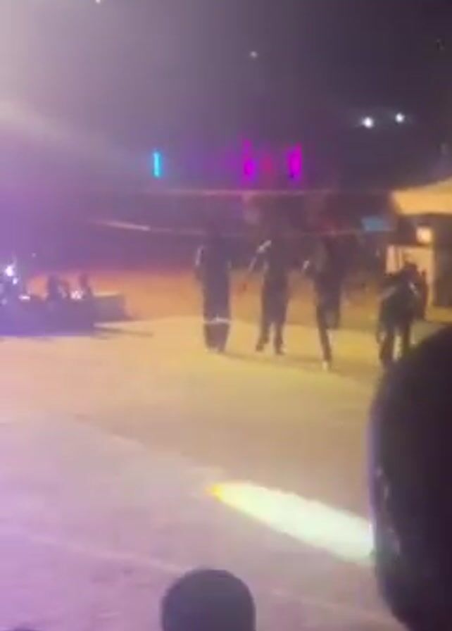night scene with a brightly lit area, possibly a stage or performance space. Several people are walking across the lit area. There is a net strung up, suggesting it could be a sports area or a barrier. The lighting is a mix of colors, including purple, blue, and white. In the foreground, there is a person with their back to the camera. The focus is on the people moving in the illuminated area. The video is somewhat blurry, but the general activity and environment are visible.