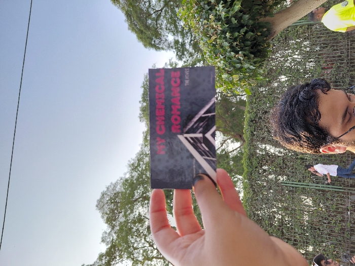 A person holds a "My Chemical Romance" album cover. The album cover is black with red text. The background includes trees, a sky, and a crowd of people behind a metal fence. A person with dark hair and glasses is partially visible to the right of the album cover. The photo appears to have been taken outdoors during the day.