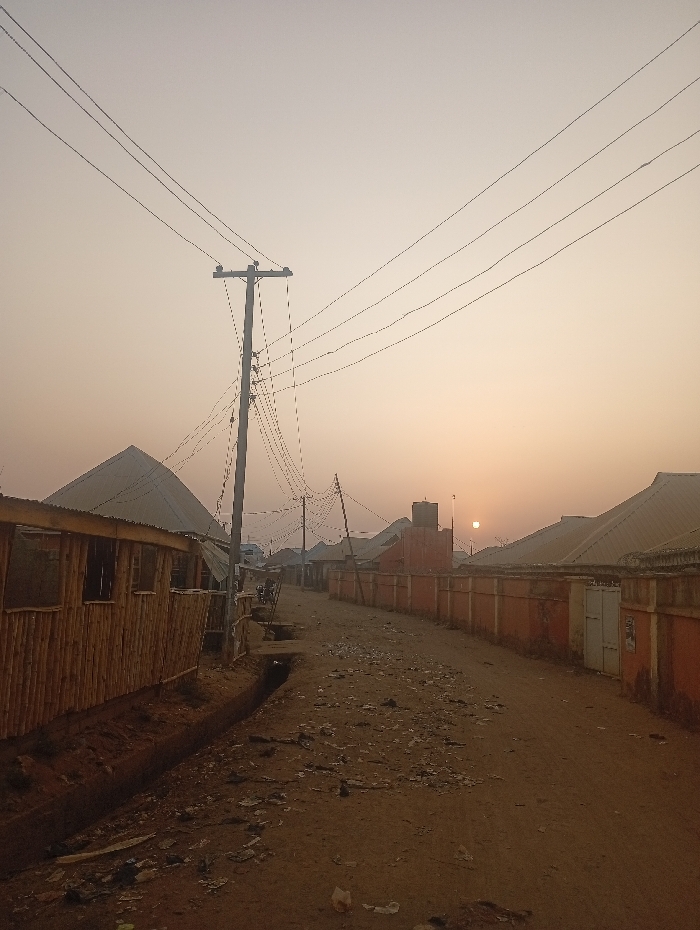 - "This image depicts an unpaved residential street in Ado, Nigeria, illuminated by the low light of either sunrise or sunset, with a distinct solar disk visible on the right horizon against a pale orange-beige sky" by FM-ZB4eI3, licensed under CC BY 4.0