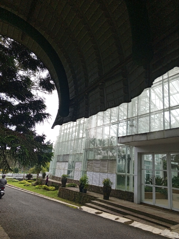 An expansive glass-walled building is framed by a curved, dark concrete structure overhead and a tree on the left. Potted plants line the base of the building, and a person on a motorcycle rides along a paved road in the foreground. Steps lead up to a doorway in the building's corner. The scene is outdoors, suggesting a botanical garden or similar horticultural facility.