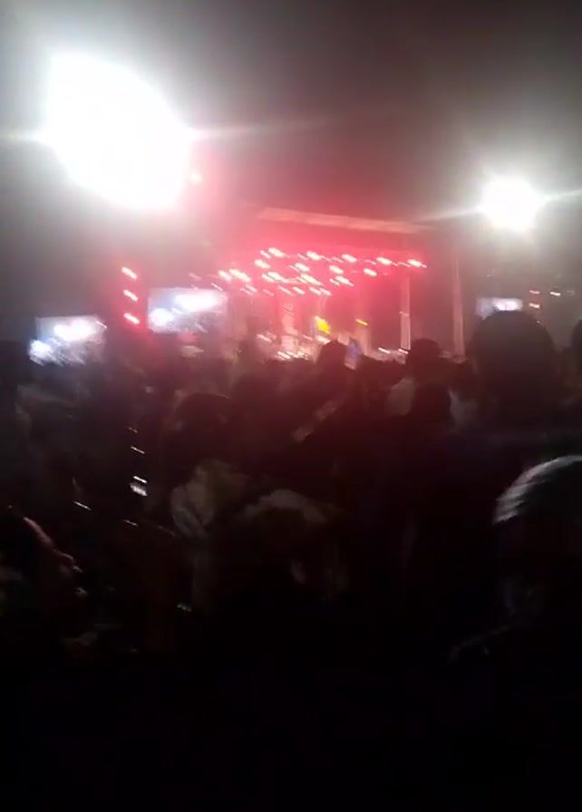 concert stage from the perspective of someone in the crowd. The stage is lit with bright white and red lights. There are screens on either side of the stage. A band or performers are visible on the stage but are difficult to discern due to the distance and lighting. The crowd is densely packed, with many people holding up their phones. It is nighttime. The overall atmosphere appears energetic and festive.