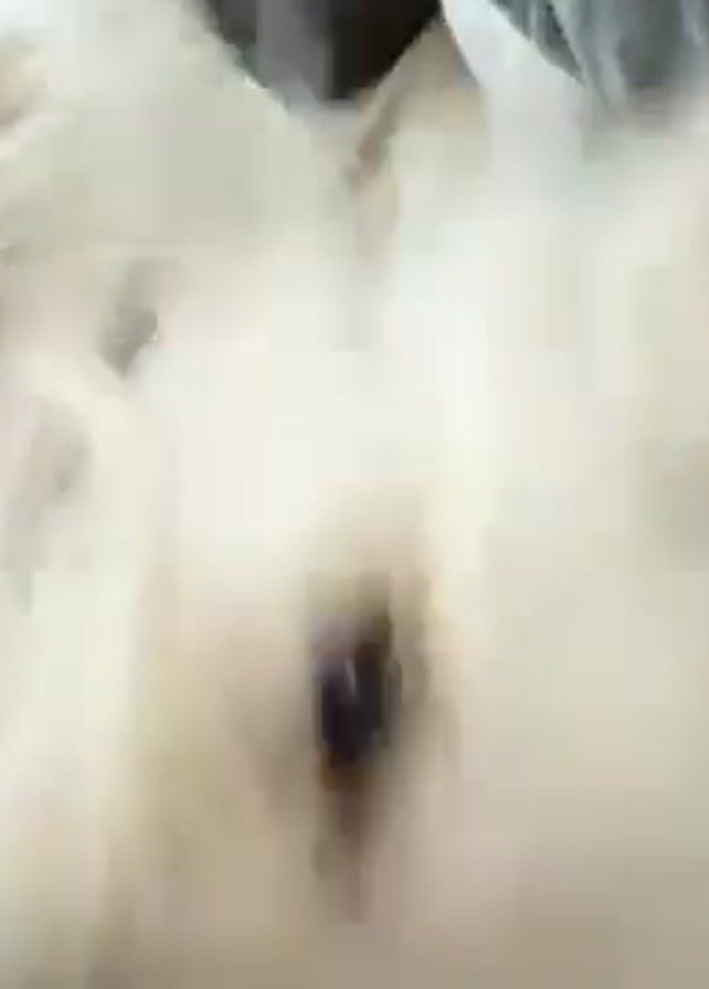 close-up of a white dog lying on its side on a bed, mostly covered by a gray, plush blanket. The dog briefly sticks out its tongue, then looks directly at the camera with its dark eyes. The camera angle is slightly above the dog, giving a clear view of its face and the blanket covering its body. The background is a plain, light-colored bedsheet.