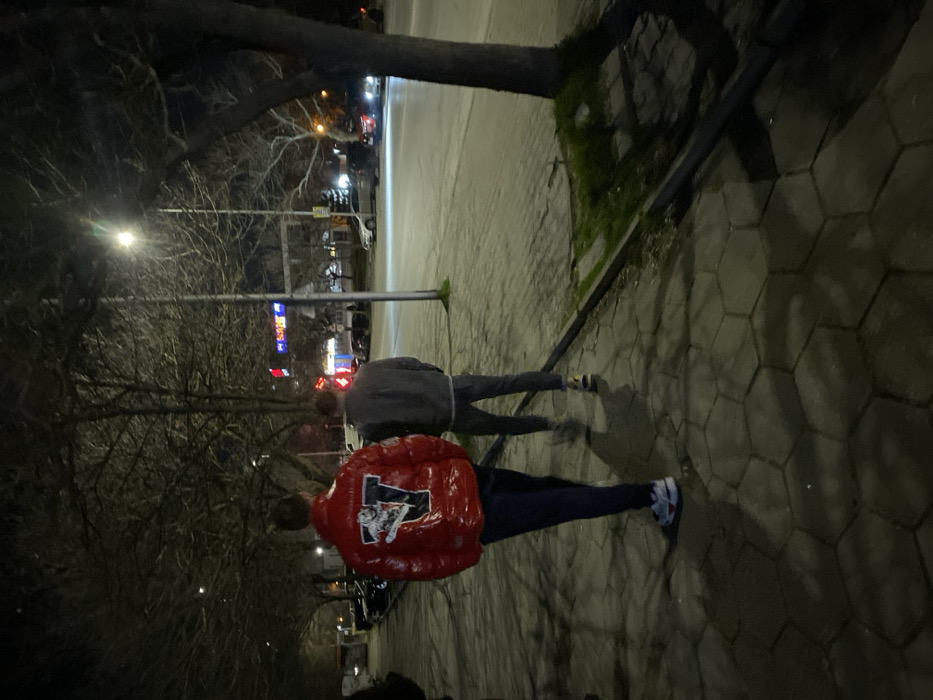 The image depicts a nighttime street scene in the city of Plovdiv, Bulgaria. Two males are walking away from the camera on a hexagonal-tiled sidewalk. The individual on the left wears a glossy red puffer jacket with a large white "V" logo featuring a stylized animal head, dark trousers, and white sneakers with red details. The individual on the right wears a dark grey jacket, dark grey jeans, and sneakers with yellow accents. Bare deciduous trees line the sidewalk, casting shadows. A bright streetlight pole is prominent in the mid-ground. To the right of the sidewalk is a paved road with multiple parked and moving vehicles, their lights visible. In the background, across the street, illuminated signs from commercial establishments are visible. Small patches of green grass are present between the sidewalk and the road curb.