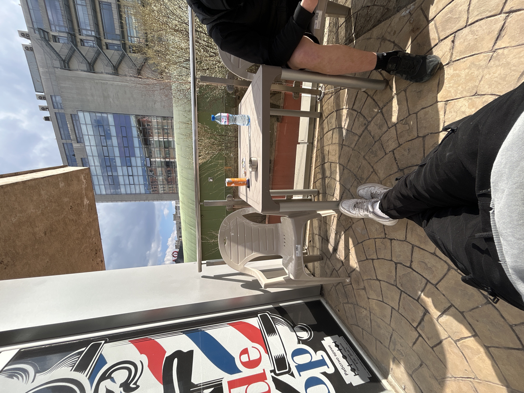 The image provides a first-person view from a balcony or terrace in Sofia, Bulgaria, looking towards the vicinity of Paradise Center. In the immediate foreground, the photographer's legs are extended, clad in black trousers and white Nike Air Force 1 sneakers. To the right, the lower leg and foot of a second individual are visible, wearing black shorts and black New Balance sneakers. The balcony features a light brown square plastic table holding a blue plastic bottle of Devin mineral water, an orange aluminum can, and a metal ashtray containing cigarette butts. Two light brown plastic chairs are present; one is empty on the left, while the other is partially occupied by the second person on the right. The balcony floor is paved with tan and brown interlocking pavers forming a decorative pattern. A metal railing with transparent panels runs along the edge of the balcony. On the left, a large barbershop sign is mounted on a white wall. The sign displays a traditional red, white, and blue barber pole design, a straight razor graphic, and Cyrillic text indicating "Работно време" (Working hours) as "Понеделник - Неделя" (Monday - Sunday) from "10:00 - 20:00 ч." (10:00 AM - 8:00 PM). The background is dominated by a large, multi-story building characterized by a concrete facade with extensive reflective glass sections on its lower levels, and concrete upper sections with smaller windows and several rooftop HVAC units. External metal fire escapes are visible on the right side of this structure. Below the large building, a distinctive green corrugated roof is visible, likely part of a commercial complex. Sparse trees with white blossoms are scattered in the mid-distance. The sky is partly cloudy with blue patches. A red commercial logo is faintly visible on a distant rooftop above the green roof, further confirming the urban retail environment near Paradise Center. The scene depicts two individuals relaxing on an urban balcony.