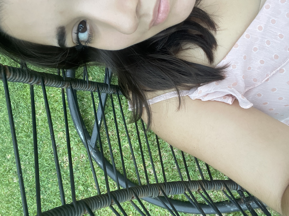 The image displays a close-up, high-angle view of a female subject situated outdoors in Coatzacoalcos, Mexico. The subject's face, partially obscured, shows her right eye with a brown iris and distinct eyelashes, the bridge of her nose, and her light pink lips. Her dark brown, shoulder-length hair is visible around her face and shoulder. She is wearing a light pink, spaghetti-strap top or dress with small, lighter pink polka dots and a ruffled trim on the right side. Her right arm and shoulder are prominent, resting upon a dark-colored, possibly metal or wicker, chair. The chair's structure consists of thin, horizontal black bars forming the backrest, supported by vertical elements, some appearing coiled or textured. A broader, dark, curved support beam of the chair is visible beneath these bars. Green grass forms the background and floor, indicating an outdoor environment, likely a garden or lawn. The scene is lit by natural daylight.